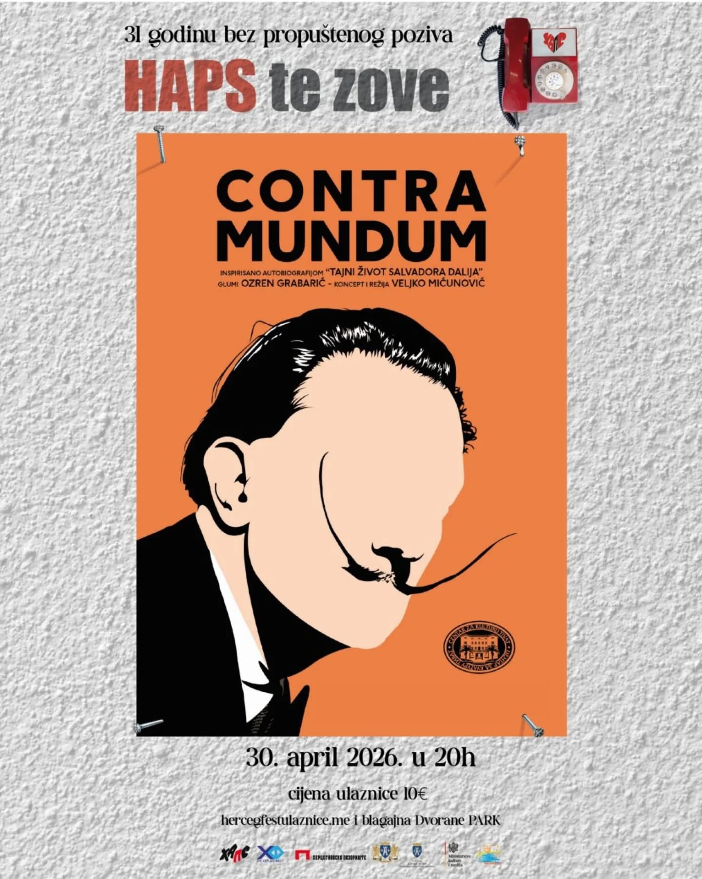 The latest production of the Tivat Culture Center, the theater play “CONTRA MUNDUM”, inspired by the autobiography “The Secret Life of Salvador Dali”, is a masterpiece that rounds off the selection of the 31st HAPS Theater and Music, presenting the majesty of the Actor, the Director and the magnificent relationship of musical, visual, narrative, mime, humorous and emotional experience in the theater.