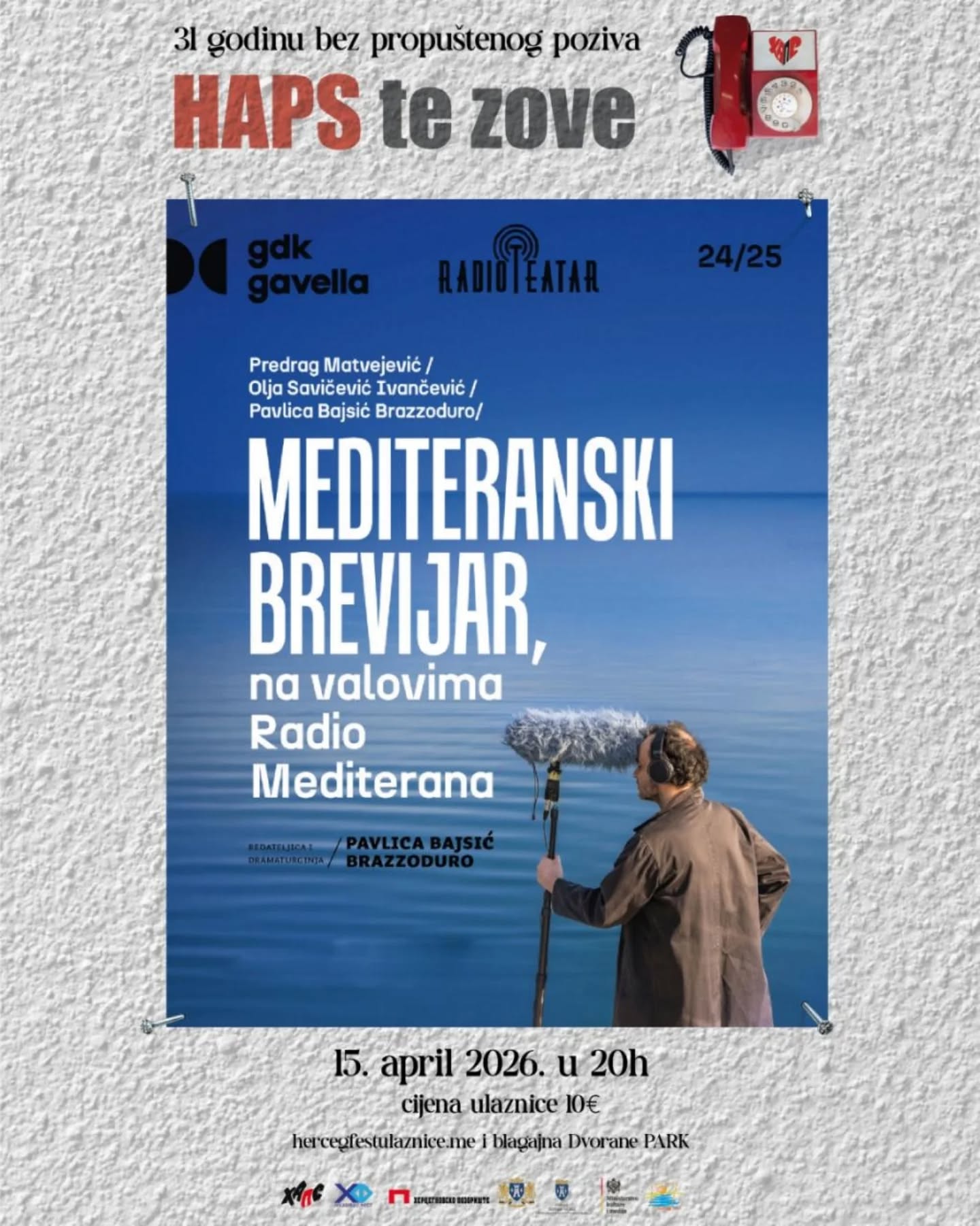 The performance “MEDiterranean Breviary, on the waves of Radio Mediteran”, Radio Theater “Bajsić i friends” / City Theater “Gavella” Zagreb, will be performed on the stage of Dvorana Park, on Wednesday, April 15, starting at 8 p.m.