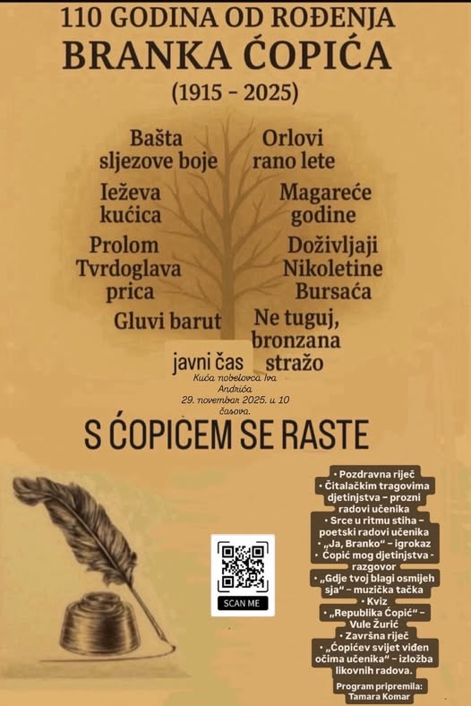 Povodom 110 godina od rođenja Branka Ćopića u Kući nobelovca Iva Andrića će se u subotu 29. novembra, u 10 časova, održati javni čas pod nazivom „Uz Ćopića se raste“.