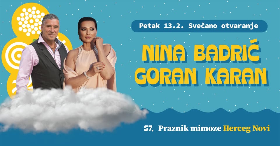 U petak 13. februara, biće upriličeno Svečano otvaranje 57. Praznika mimoze. Povorka Gradske muzike i mažoretki Herceg Novi, Mjesne muzike Đenović, trombonjera i maškara kreće u 19 časova sa Trga Nikole Đurkovića do platoa hotela Igalo. Ceremonija otvaranja počeće u 20.30 časova nakon čega će koncert održati dvoje velikana regionalne pop scene, Nina Badrić i Goran Karan (21 č).