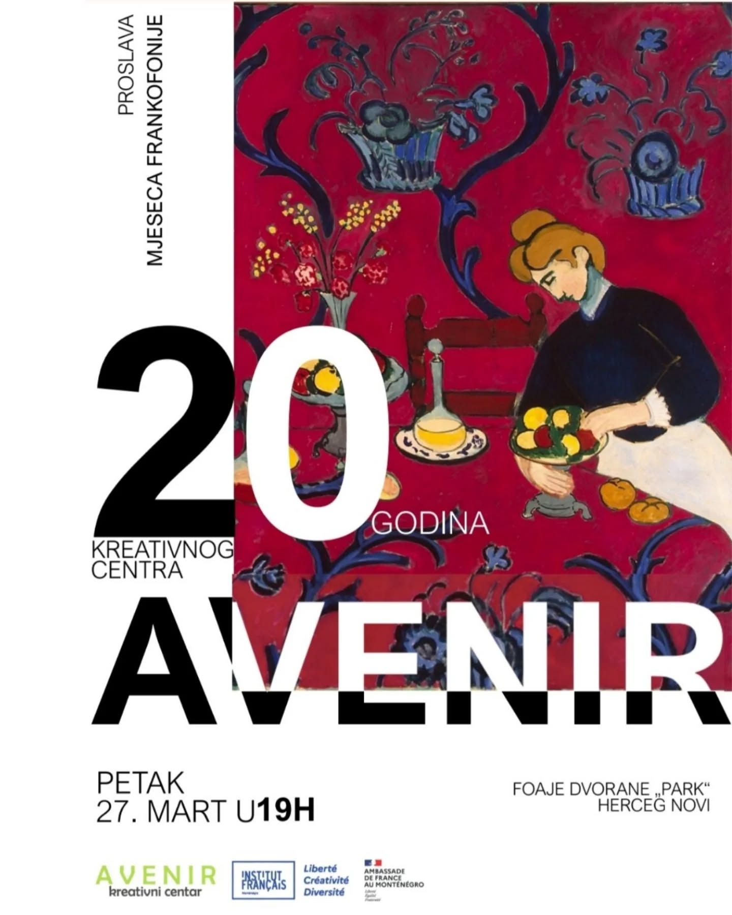 Uveličajte vašim prisustvom Svečanost povodom 20. rođendana Kreativnog centra „Avenir“, koji od 2006. godine predstavlja jedan od najznačajnijih stubova Frankofonije u Crnoj Gori. Kroz audiovizuelne projekcije, priče bivših učenika, muzičke tačke, poeziju i pozorište, zaronite u istoriju ove organizacije, koja je iznjedrila veliki broj frankofona i frankofila svih generacija.
