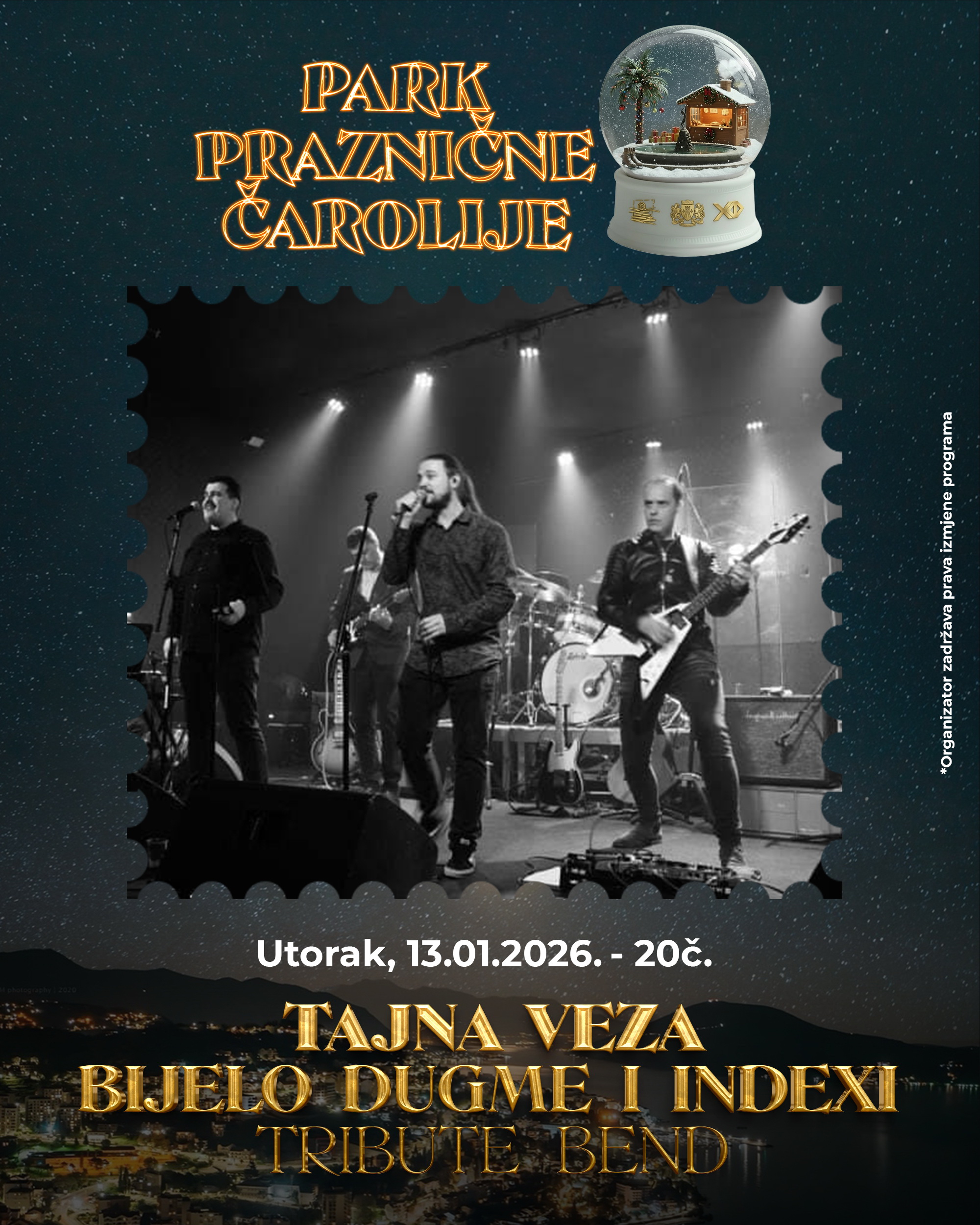 U utorak 13. januara, u 20 časova, Park Boka – „Park praznične čarolije“ ugostiće Tribute band “Tajna veza” (Bijelo Dugme i Indexi) sastavljen od profesionalnih muzičara, koji će publici predstaviti kompilaciju hitova dva velika benda Bijelo Dugme i Indexi, brojne bezvremenske hitove uz koje smo odrasli.